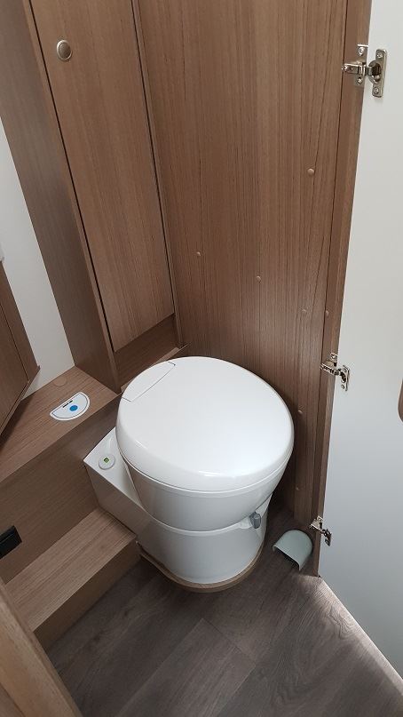 Kassettentoilette mit elektrischer Pumpe und drehbarem Sitz.