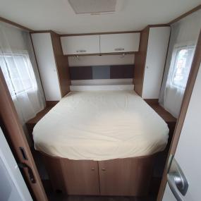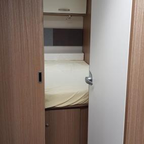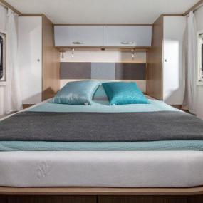 Das Doppelbett im Heck ist ein sogenanntes Queens-Bett. Bei dieser Bettenart kann jeder Benutzer auf seiner Seite separat ein- und aussteigen. Jede Bettseite ist zudem mit einem Kleiderschrank versehen. Weitere Schränke gibt es oberhalb und unter dem Bett. Am Bett gibt es eine USB-Steckdose.