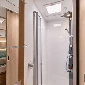 Das Schafzimmer mit dem Queens-Bett im hinteren Bereich des Wohnmobils, Toilette/Waschbecken und Dusche im mittleren Bereich und Sitzgruppe und Küche mit dem Hubbett im Wohnbereich kann man jeweils durch eine Tür abtrennen.