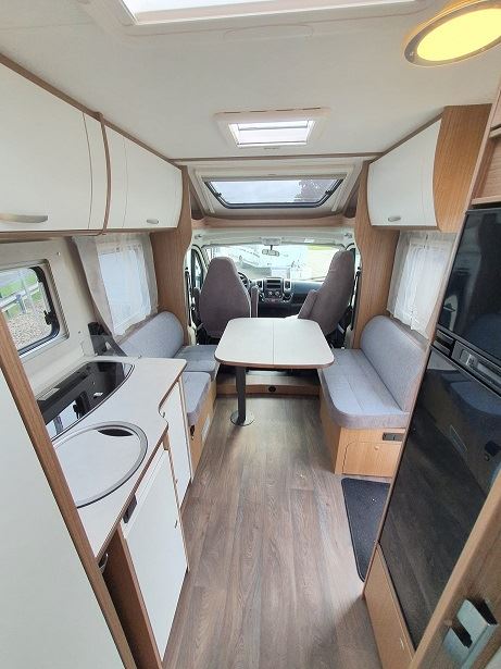 Das Wohnmobil ist im Fahrbetrieb für 4 Personen zugelassen und so sind auch 4 Sitzplätze sind mit einem Sicherheitsgurt (davon 2 x ISOFIX) ausgerüstet. Alle während der Fahrt nutzbaren Sitze sind Einzelsitze in Fahrtrichtung.