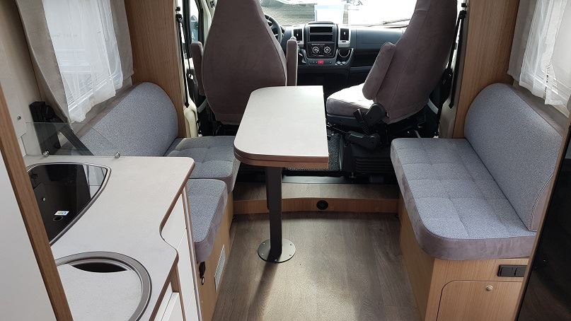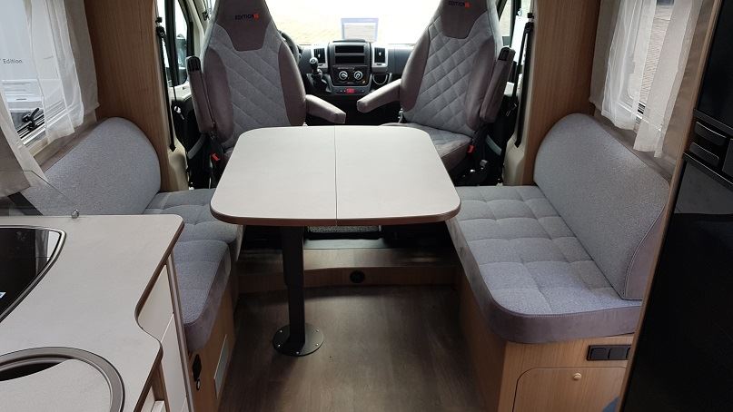 Die Sitzgruppe besteht aus zwei Sitzbänken für jeweils bis zu 2 Personen und den beiden drehbaren Vordersitzen. Bei allen Sitzpositionen sitzt man nahe am Tisch, der beweglich ist und auch teilweise entfernt werden kann.