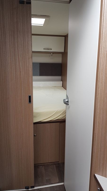 Das Doppelbett im Heck ist ein sogenanntes Queens-Bett. Bei dieser Bettenart kann jeder Benutzer auf seiner Seite separat ein- und aussteigen. Jede Bettseite ist zudem mit einem Kleiderschrank versehen. Weitere Schränke gibt es oberhalb und unter dem Bett. Am Bett gibt es eine USB-Steckdose.