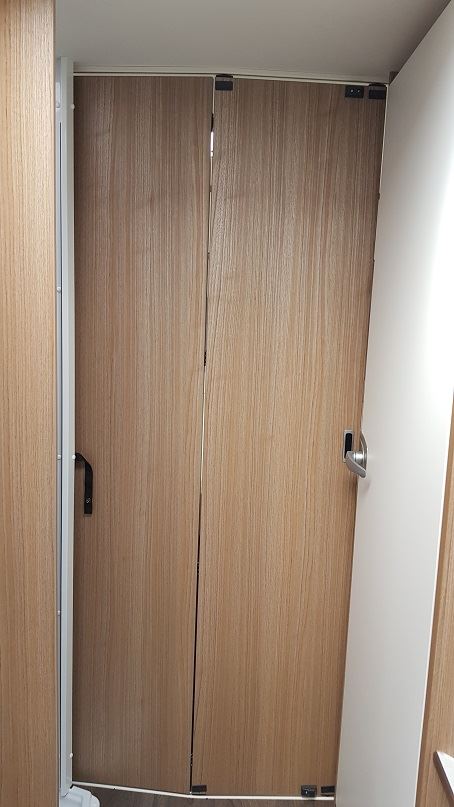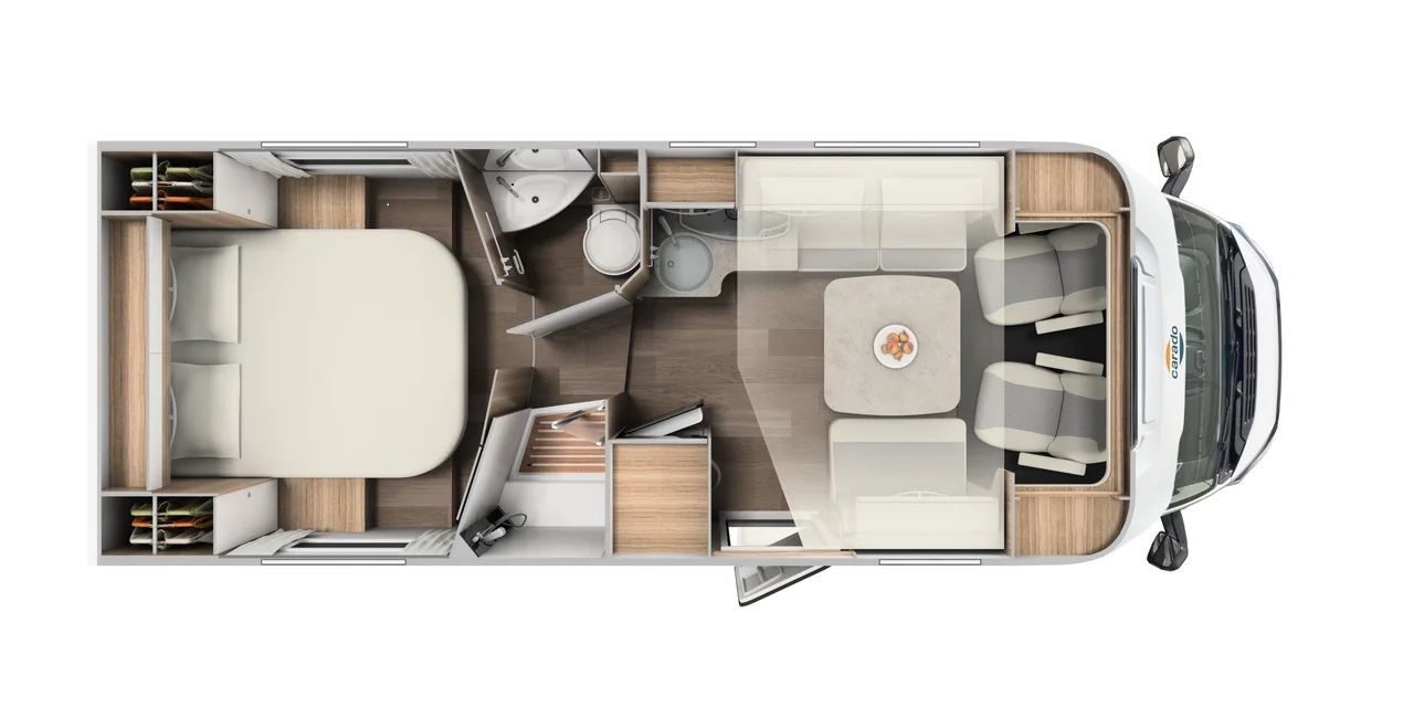 Das Schafzimmer mit dem Queens-Bett im hinteren Bereich des Wohnmobils, Toilette/Waschbecken und Dusche im mittleren Bereich und Sitzgruppe und Küche mit dem Hubbett im Wohnbereich kann man jeweils durch eine Tür abtrennen.