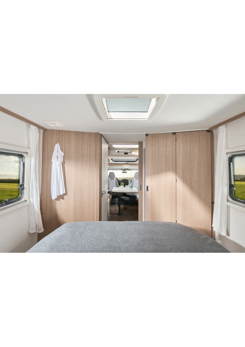 Bei den Schlafplätzen gibt es zwei Doppelbetten als französische Betten, wobei ein Doppelbett mittig längs im Fahrzeugheck und das andere in der Fahrzeugmitte angeordnet ist.