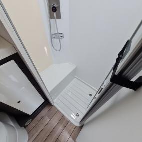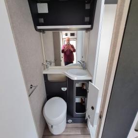 Bad mit Waschbecken, separater Dusche und drehbarer Kassettentoilette mit Entsorgung von außen.