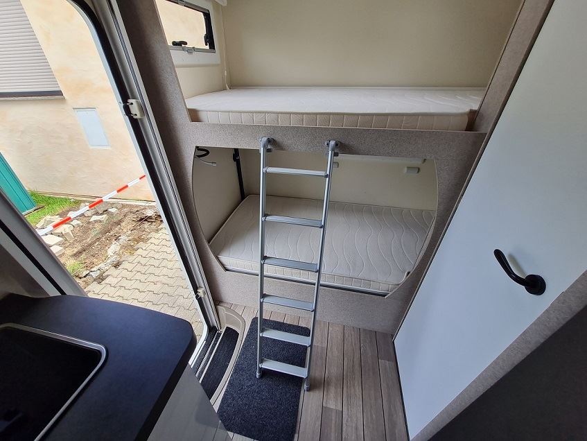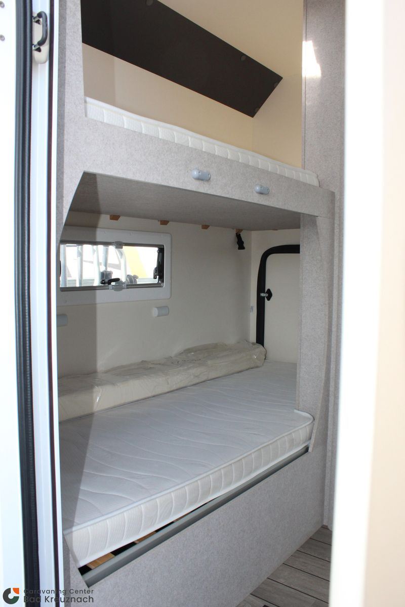 Bei den Schlafplätzen gibt es 4 feste Betten. Dabei befinden sich quer im Heck zwei Etagenbetten, wobei das obere mit einem Fallschutznetz versehen ist.
