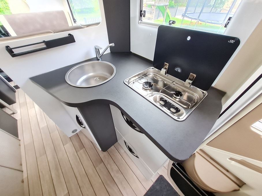 In der Küche gibt es einen 2-Flammen-Gasherd mit elektrischem Zünder und einen geräumigen Arbeitsbereich.