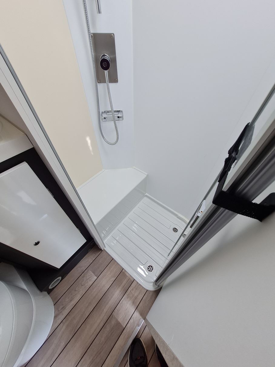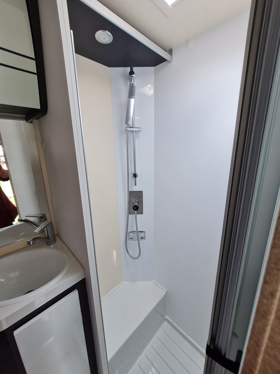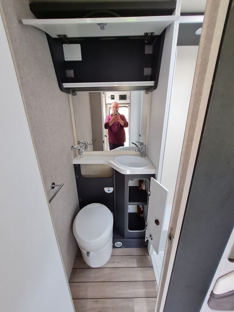 Bad mit Waschbecken, separater Dusche und drehbarer Kassettentoilette mit Entsorgung von außen.