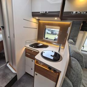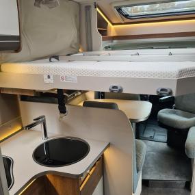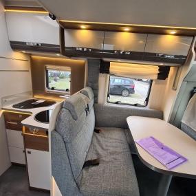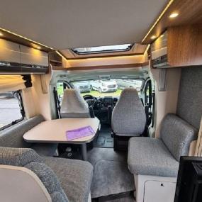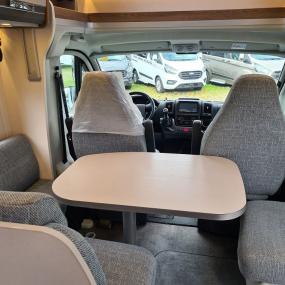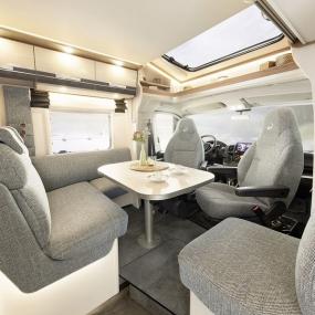 Dieses in Deutschland produzierte Wohnmobil verfügt über 6 Sitzplätze in einer Sitzgruppe, davon 2 drehbare Vordersitze. Der Tisch ist in Längs- und Querrichtung beweglich. So kann man immer nahe am Tisch sitzen und hat einen freien Zugang zum Führerhaus.