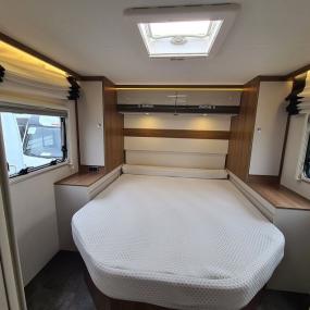 Queens-Bett als französisches Bett - höhenverstellbar - ausgestattet mit Lattenrost und USB-Anschluss, mittig längs im Heck mit beidseitigem separaten Ein- und Ausstieg und Bettverlängerung.