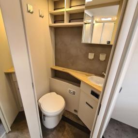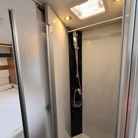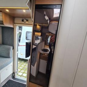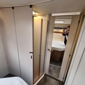 Das Schafzimmer mit dem Queens-Bett im hinteren Bereich des Wohnmobils, Toilette/Waschbecken und Dusche im mittleren Bereich und Sitzgruppe und Küche mit dem Hubbett im Wohnbereich, kann man jeweils durch eine Tür abtrennen.