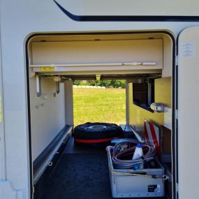 Die Heckgarage ist mit Beleuchtung, einer 220-Volt-Steckdose mehreren flexiblen Verzurrösen und einem Antirutschboden ausgestattet.