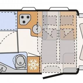 Bei den Schlafplätzen gibt es zwei Doppelbetten als französische Betten, wobei ein Doppelbett mittig längs im Fahrzeugheck und das andere in der Fahrzeugmitte angeordnet ist.
