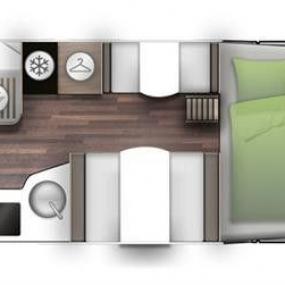 Mit wenigen Handgriffen können die Tische mit Zusatzmobiliar zu einem weiteren Bett umgebaut werden, wodurch sich die Gesamtzahl der Schlafplätze auf 7 erhöht.