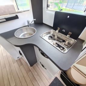 In der Küche gibt es einen 2-Flammen-Gasherd mit elektrischem Zünder und einen geräumigen Arbeitsbereich.